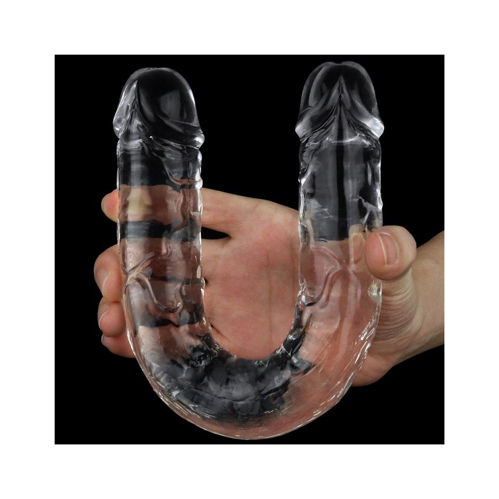 Dvojité dildo s realistickým povrchem stejnoměrně široké na obou koncích. průhlednost a příjemný měkký materiál typ dilda, který má oba konce stejně široké snadná údržba