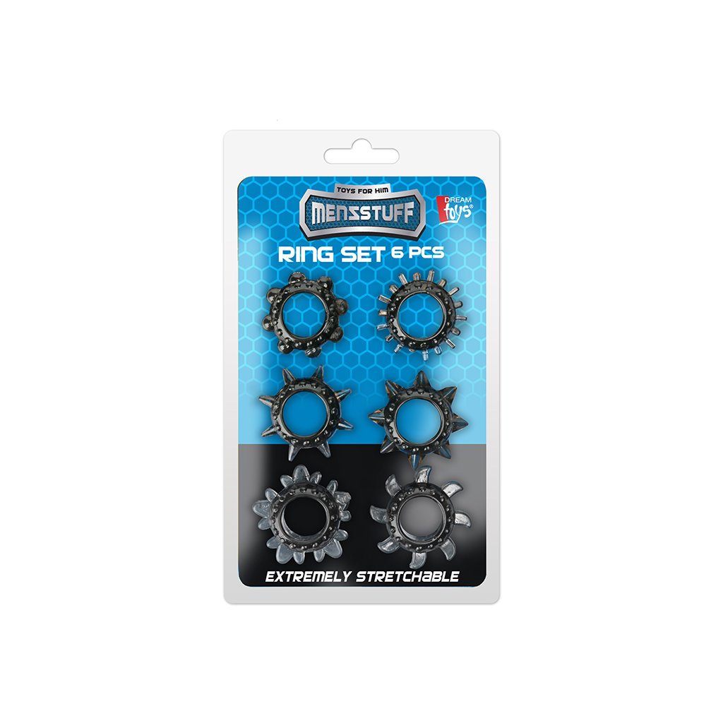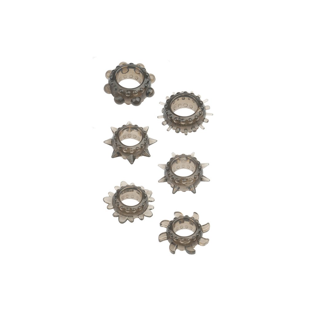Sada šesti erekčních kroužků vysoké kvality z materiálu TPE, jsou velice pružné, mohou se roztáhnout až na čtyřnásobek a jsou velmi pohodlné. Každý kroužek má jiný design se stimulačními výstupky, které budou dráždit partnerku při každém průniku.