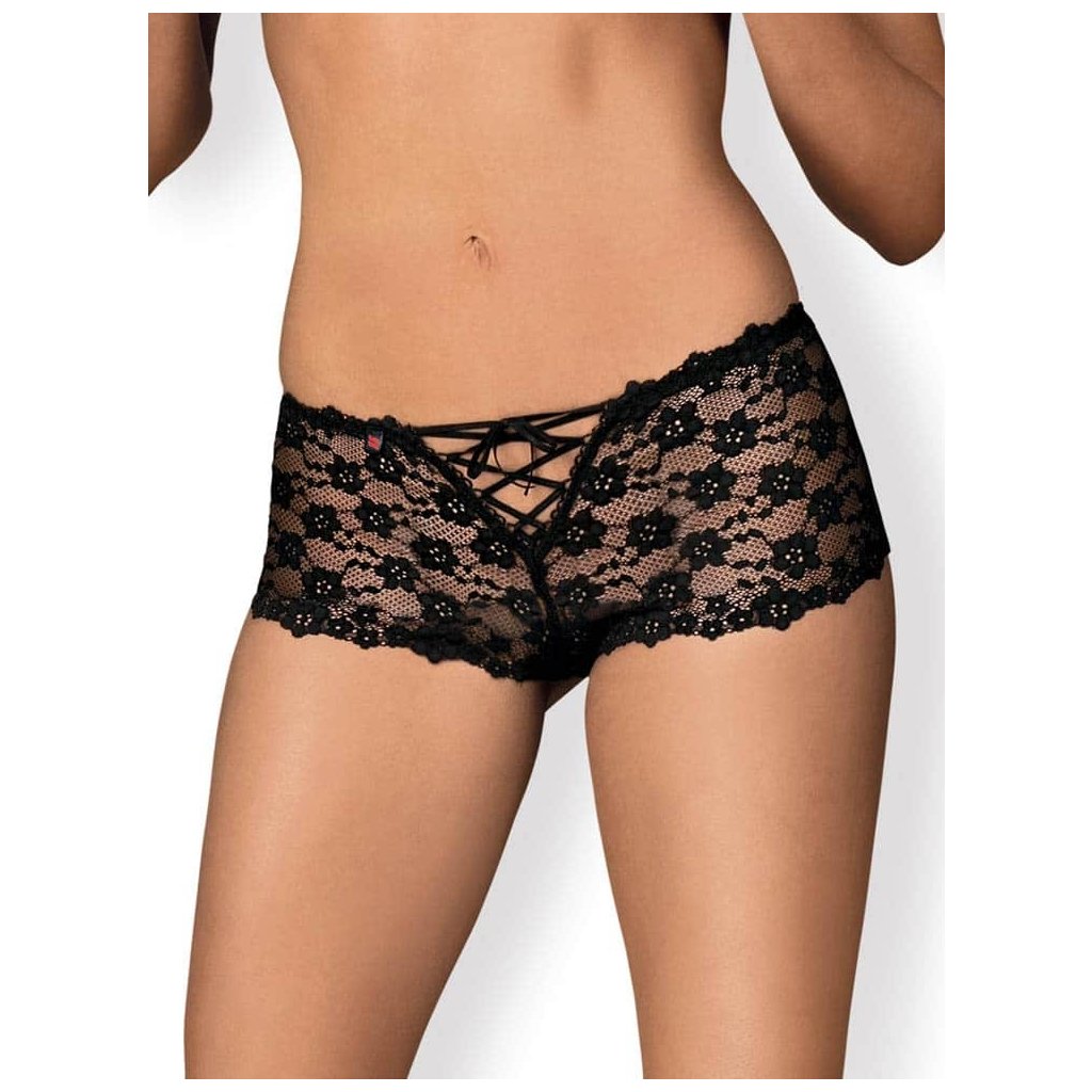 Průsvitná černá krajka s květinovým motivem, v přední části se zavazováním na stužku, vzadu jsou vykrojené pro dokonalý vzhled zadečku.