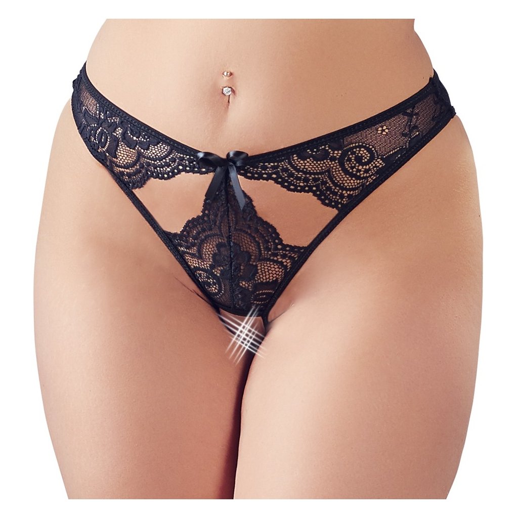Svůdné sexy krajkové tanga s otevřeným rozkrokem, který dodává na pikantnosti. Smyslná černá krajka s květinovým vzorem v kontrastní barvě.