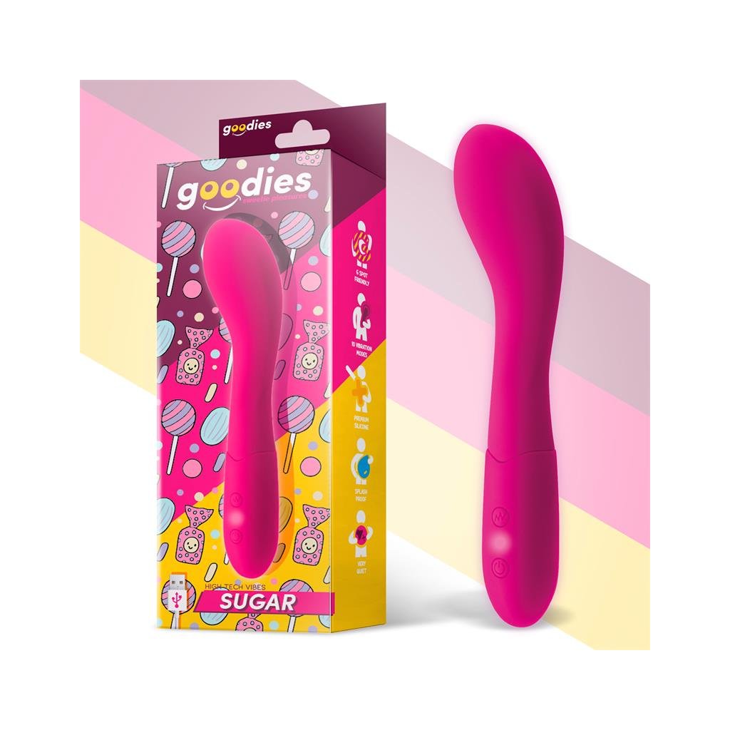 Hračky značky Goodies jsou vyrobeny z nejkvalitnějšího prémiového silikonu a ABS materiálu. Tvar silikonového vibrátoru Sugar byl navržen pro lepší stimulaci bodu G. Má 10 vibračních funkcí a výkonný, ale přitom velmi tichý motor. Měkký materiál s hedvábným povrchem si zamilujete již při prvním použití a věřte, že ho již nebudete chtít vyměnit.