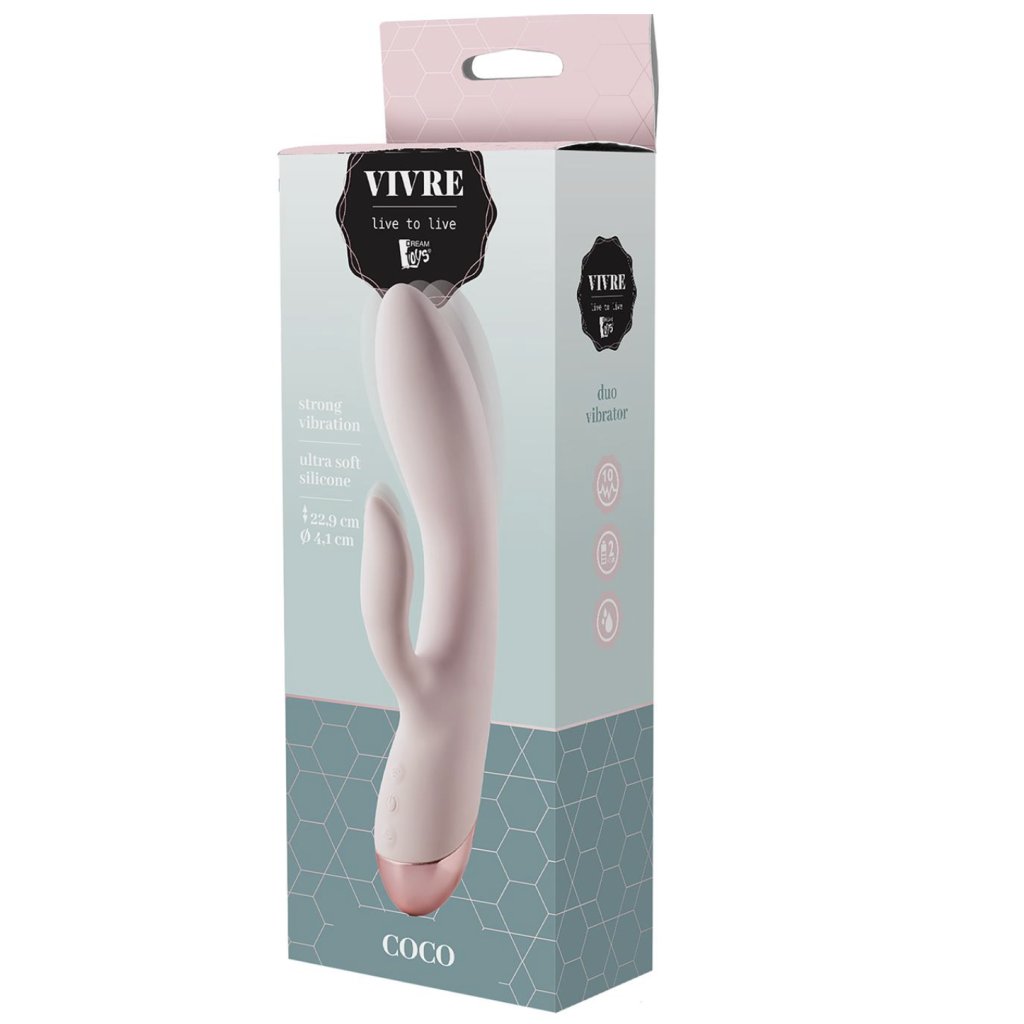 Coco je duo vibrátor z měkkého pevného silikonu a ABS s mírně ohebným, zakřiveným tělem a ohebným stimulátorem klitorisu. Duo vibrátor je bezpečný pro tělo, neobsahuje latex a ftaláty. Je vybaven 2 motory, které nabízejí silné a hluboké vibrace, se 3 rychlostmi a 7 rytmy, takže si každý může vybrat oblíbené nastavení stimulace. Ovládání je snadné pomocí 3 tlačítek. Hřídel a stimulátor klitorisu mají vlastní motor a vlastní tlačítko pro přizpůsobení zážitku. Gigi lze používat ve vaně nebo ve sprše, protože je zcela vodotěsný. Součástí balení je kabel s USB konektorem pro dobíjení. Coco je součástí řady hraček Vivre od společnosti Dream Toys. Francouzské slovo znamená "žít" a řada Vivre je určena mladým ženám a jejich partnerům, kteří oceňují jemnější věci v životě, mají rádi pastelové barvy místo křiklavých křiklavých barev, ženám a mužům s vytříbeným životním stylem, kteří dávají přednost kvalitě před kvantitou. Díky jemné růžové barvě a růžovému metalickému akcentu v základu působí duo Coco vibe elegantně a na úrovni. Odpovídající balení má na bočních panelech ikony znázorňující funkce. Na zadní straně krabičky se jako obvykle u výrobků Dream Toys nachází popis výrobku v 7 jazycích.