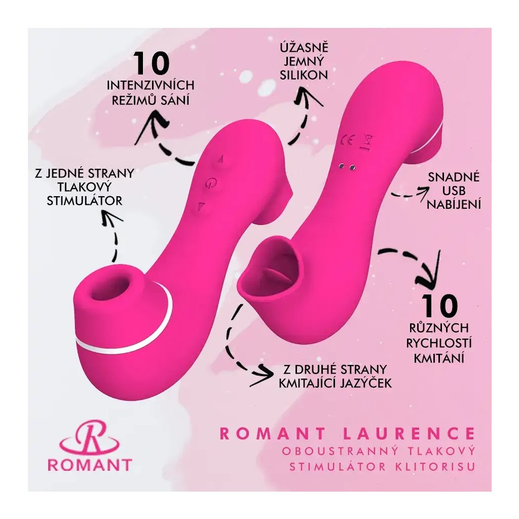 Romant Laurence Suction je výrobek určený ke stimulaci klitorisu. Jak funguje? Je to výrobek stejného typu jako produkty Womanizer nebo Satisfyer, ovšem s vlastním technickým řešením. Jeho zobáček se klitorisu nemusí ani přímo dotýkat. Zobáček stačí na klitoris nasměrovat a spustit požadovanou úroveň intenzity podtlakových vln. Podtlak klitoris nasaje do zobáčku a poté ho pomocí podtlakových vln stimuluje. K novému silnému zážitku už je potom velmi blízko.