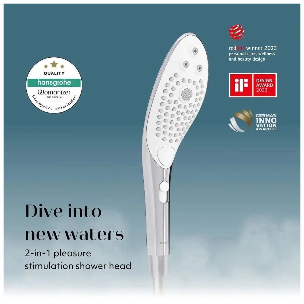 Womanizer Wave je vůbec první kombinovaná sprchová hlavice a vodní masážní stimulátor klitorisu, který spojuje odborné znalosti koupelnových expertů Hansgrohe a lídrů v oblasti potěšení Womanizer a vytváří skutečně výjimečný crossover – sprchovou hlavici pro vaše erotické potěšení.