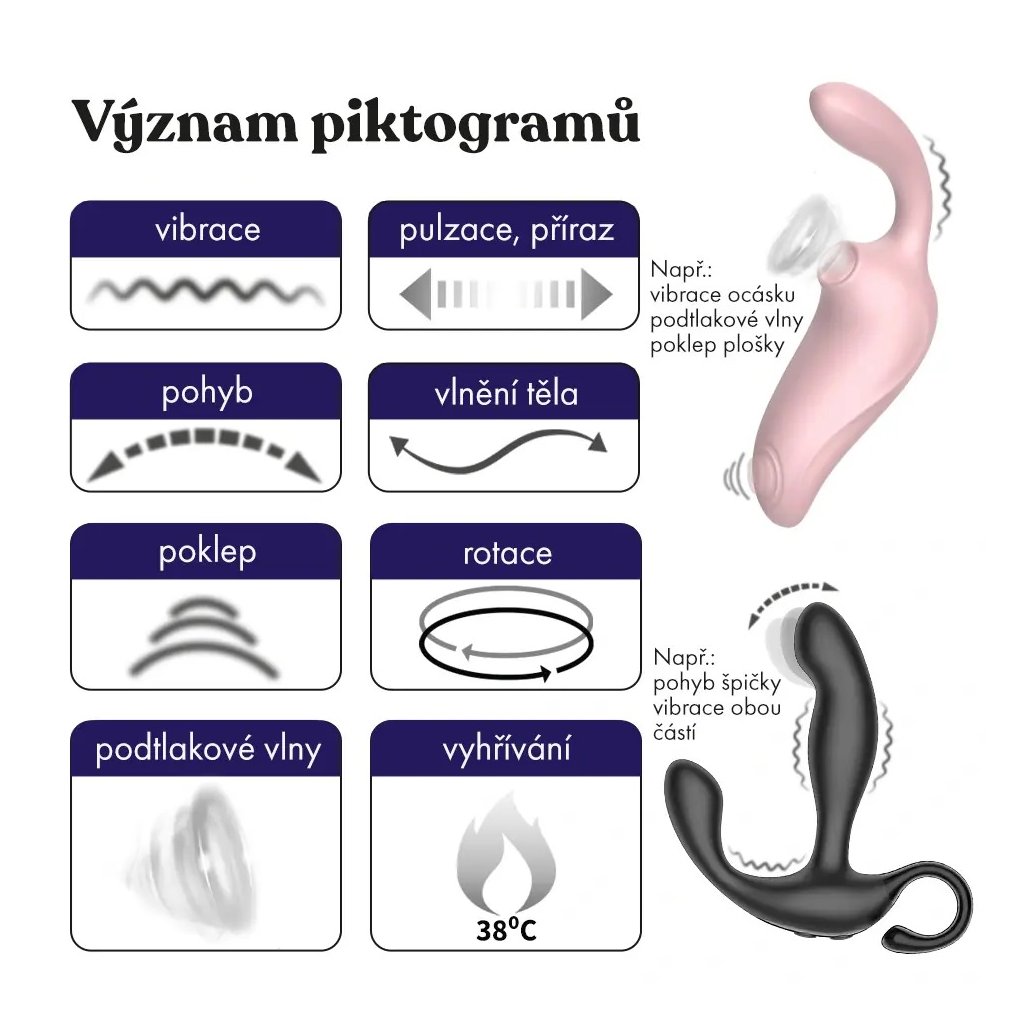 V každé části vibrátoru je samostatný motor, proto i kratší část silně vibruje. Na výběr je deset druhů vibrací, které můžete spustit jak samostatně v každé části zvlášť nebo naráz v delší i kratší části vibrátoru. To vše se ovládá pouze dvěma tlačítky.